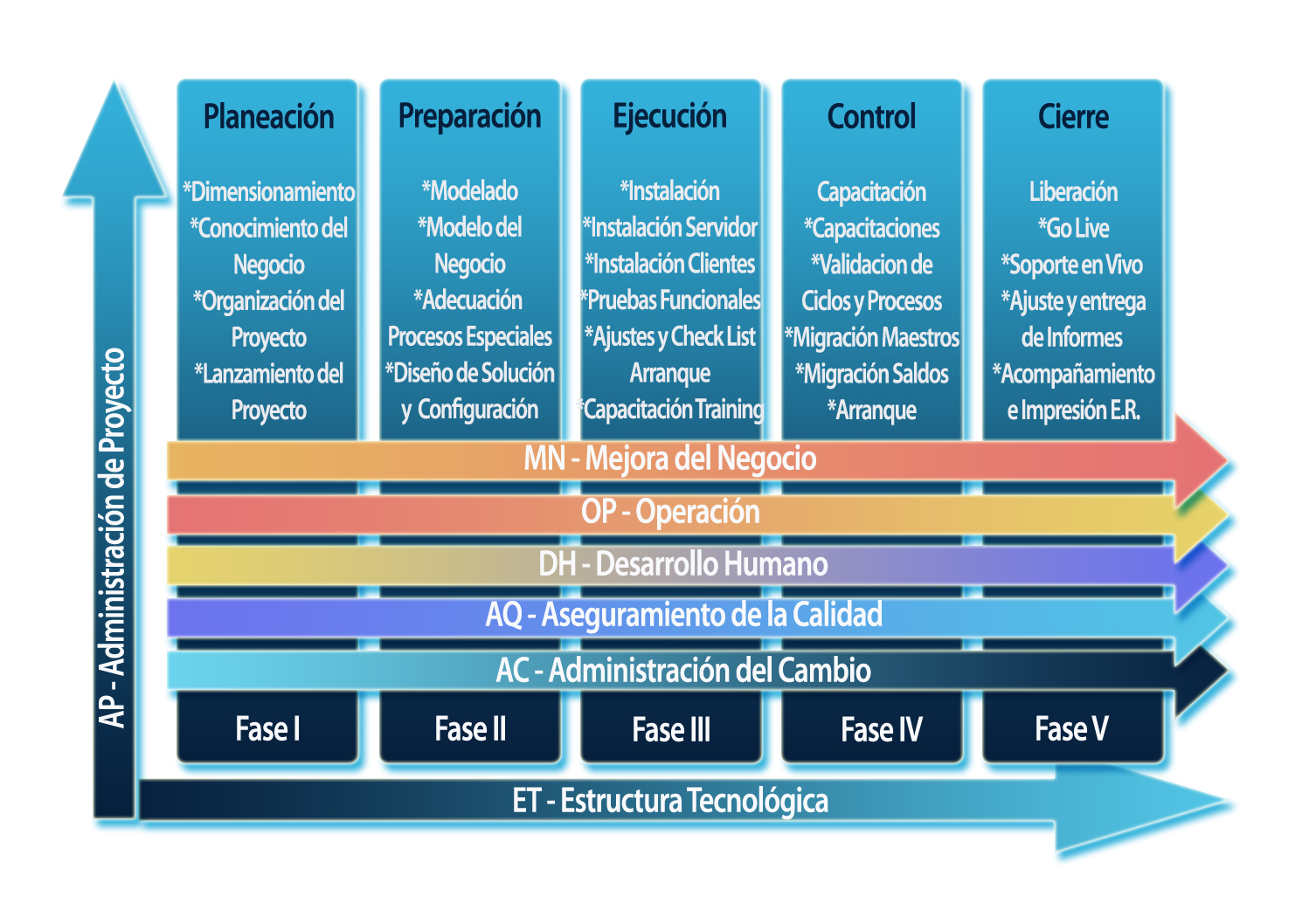 Venice-Soft a capitalizado toda su experiencia en la Administración de Proyectos, desarrollando su propia Metodología de Trabajo Basada en Mejores practicas y principios de Administracion de proyectos, Nuestra metodología de trabajo, permite administrar los proyectos de nuestros clientes en Conjunto, nosotros le proponemos y administramos su Proyecto. Control y conocimiento de avances en tiempo real, mitigacion de riesgos previo a que se presenten, control de actividades, recursos y costos es lo que le permite conocer en todo momento. El control y medición se lleva mediante la producción de entregables únicos resultantes de actividades de valor agregado que tienen como objetivo final, la eficaz administración del Proyecto en el tiempo, forma y costo definidos desde el inicio en un Contrato. La metodología Estándar establece actividades, funciones, roles, tiempos, costos, estándares y guías que facilitan la planeación, desarrollo, administración, y cierre de un proyecto de Implementación teniendo como base, la línea de acción establecida por los objetivos y expectativas del cliente. |
